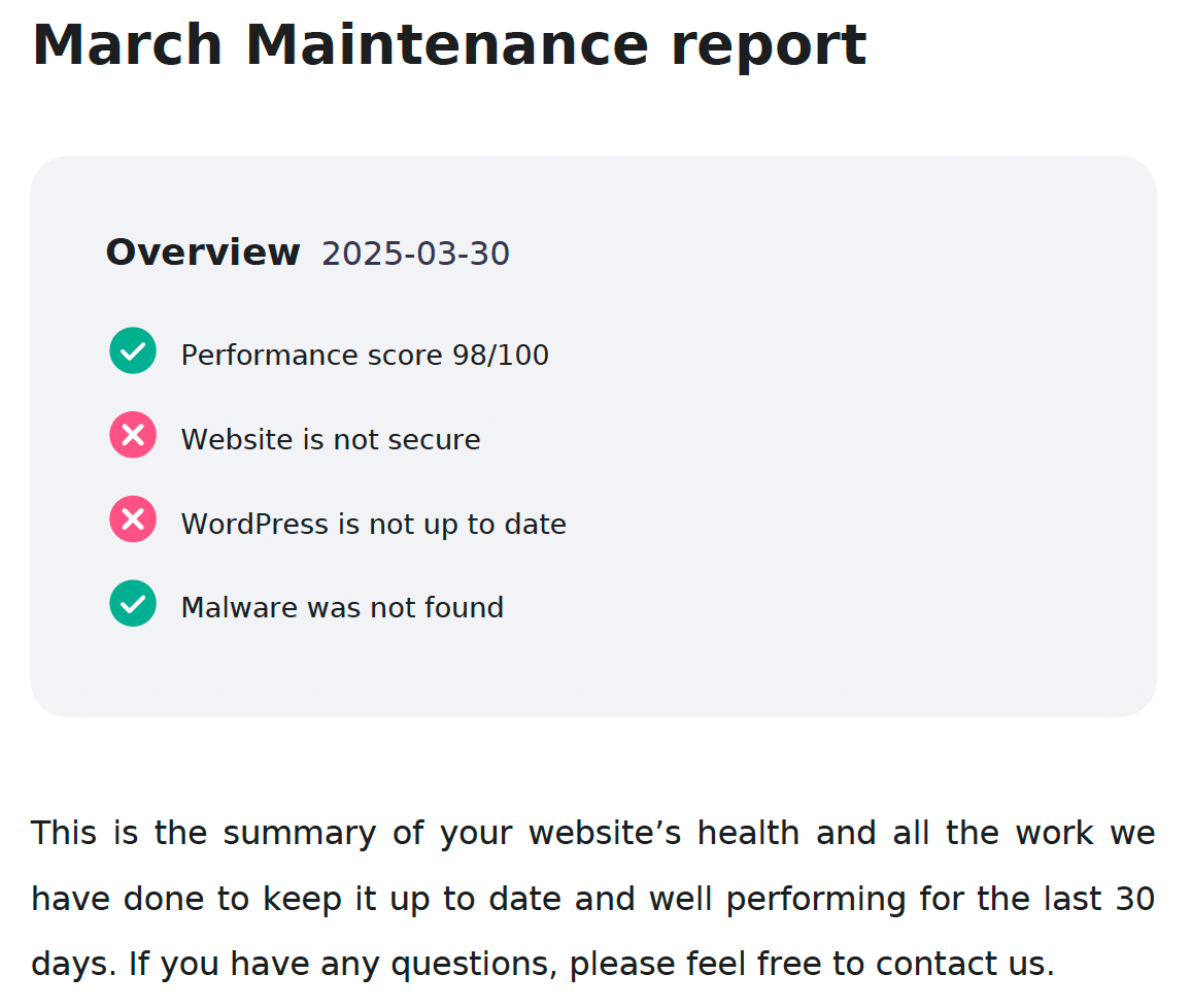 Receive regular reports detailing your website’s performance, uptime monitoring, security checks, backups, updates, and more. Never wonder what is going on with your website, hosting, or maintenance: the reports will keep you informed.